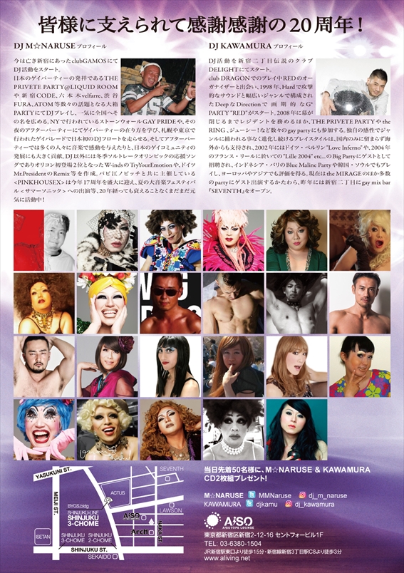 MIRAGEのほか多数のpartyにゲスト出演するかたわら、昨年には新宿二丁目にgay mix bar 『SEVENTH』をオープン。