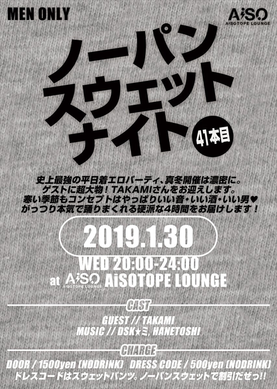 ・下着を履かずにスウェットパンツをはく「ノーパンスウェット」がドレスコードです。お得な価格でご入場いただけます。