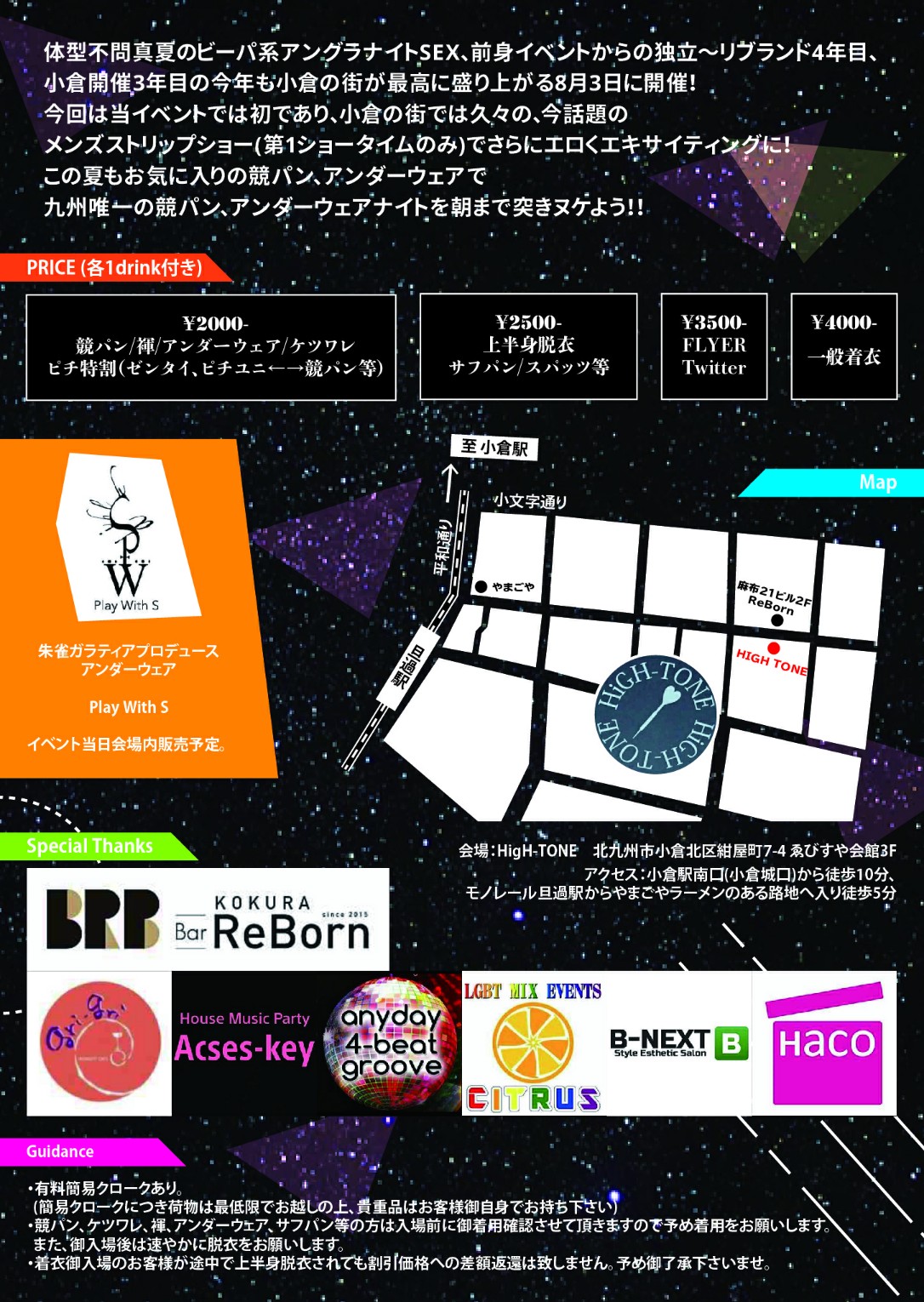 競パン・アンダーウェアナイト SEX、この夏も熱く盛り上がる小倉で今回は新会場で開催♪ 定番オネハ、人気のJ-Pop、K-PopやEDMなど多彩なDJタイムに、華麗!?抱腹絶倒!?なドラァグクイーンショー、メンズストリップショーなど超特盛☆ お気に入りの競パン、アンダーウェアで九州唯一の競パン、アンダーウェアナイトを朝まで突きヌケよう!!