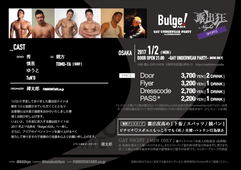 いよいよ5年目に突入する「露出狂ナイト」は4周年を迎える2017年より名称を「Bulge! ASIA」へ