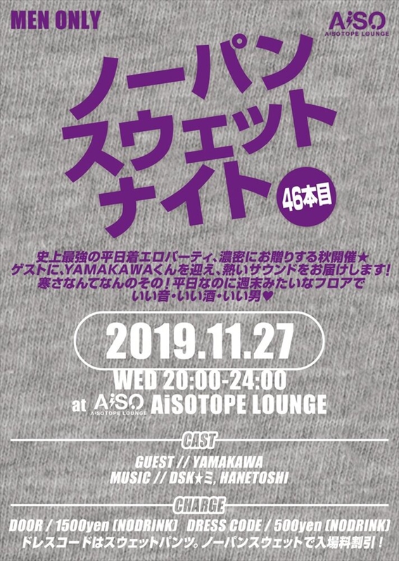 ・下着を履かずにスウェットパンツをはく「ノーパンスウェット」がドレスコードです。お得な価格でご入場いただけます。