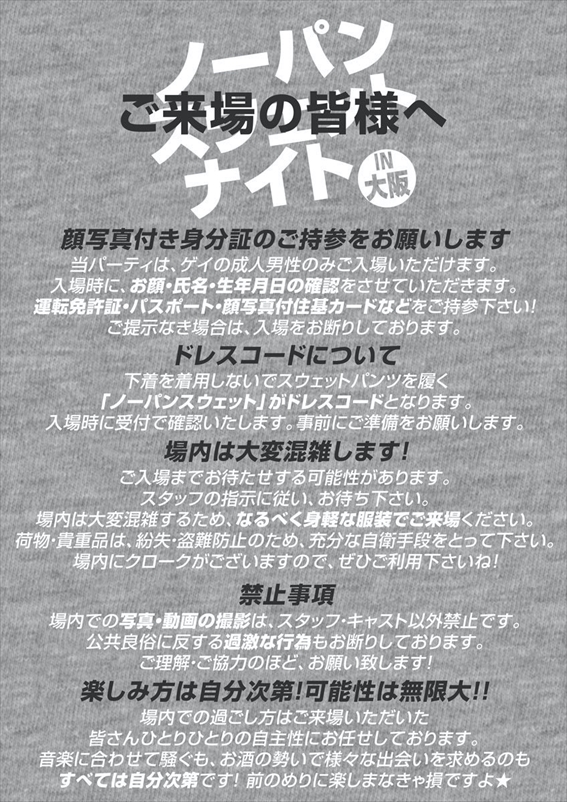 ●下着を着用せずにスウェットパンツを履く「ノーパンスウェット」がドレスコードです。お得な価格でご入場いただけます。