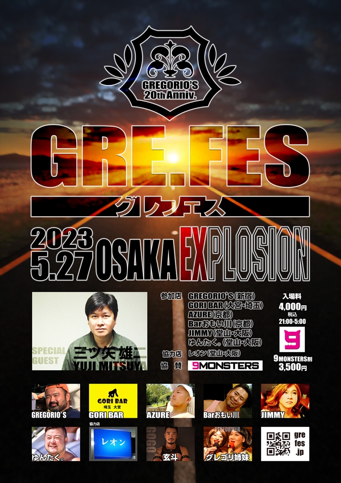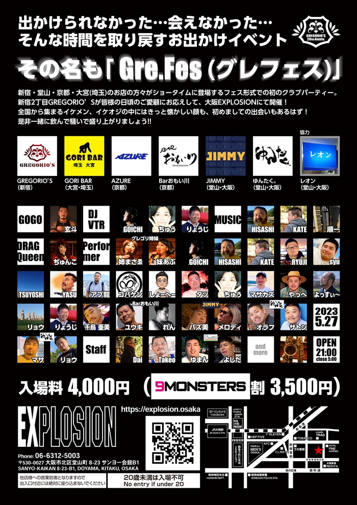新宿・堂山・京都・大宮(埼玉)のお店の方々がショータイムに登場するフェス形式での初のクラブパーティー。新宿2丁目GREGORIO’Sが皆様の日頃のご愛顧にお応えして、大阪EXPLOSIONにて開催!全国から集まるイケメン、イケオジの中にはきっと懐かしい顔も、初めましての出会いもあるはず!是非一緒に飲んで騒いで盛り上がりましょう!!