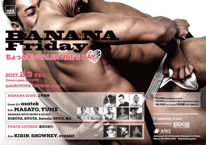 上質のお客様が集まるお洒落空間に、良質の音楽、そしてLOVELYでありながらちょっとエロな大人の遊び場。男+男+男だらけのお楽しみが溢れている夜のワンダーランド ”BANANA Friday”