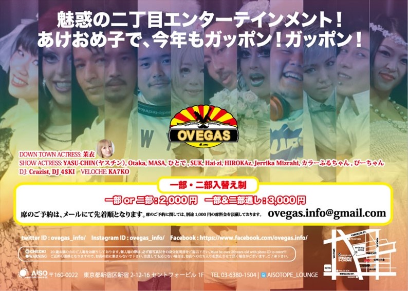 日テレ系「スター☆ドラフト会議」にて疑惑のおネエダンサーとして奮闘したダンサーYASU-CHINを筆頭に、ダンサー、ローラースケーター、GOGOパフォーマー、ドラァグクイーン、Pカップアクター、などなど個性爆発なパフォーマンス集団が繰り広げる魅惑のショーダンスの世界!ラスベガスをイメージしつつ、何処かしら昭和の香りが隠しきれないショータイム!笑いあり!ドラマあり!参加型もあり?!二丁目初めての方でも安心して楽しんで頂けるショーラウンジスタイルのイベントです!一人で遊びに来て頂いてもOK!大勢で盛り上がってもOK!出演者全員で踊り散らかし、やり散らかします!週の始まりから呑み散らかし、騒ぎ散らかしましょう!