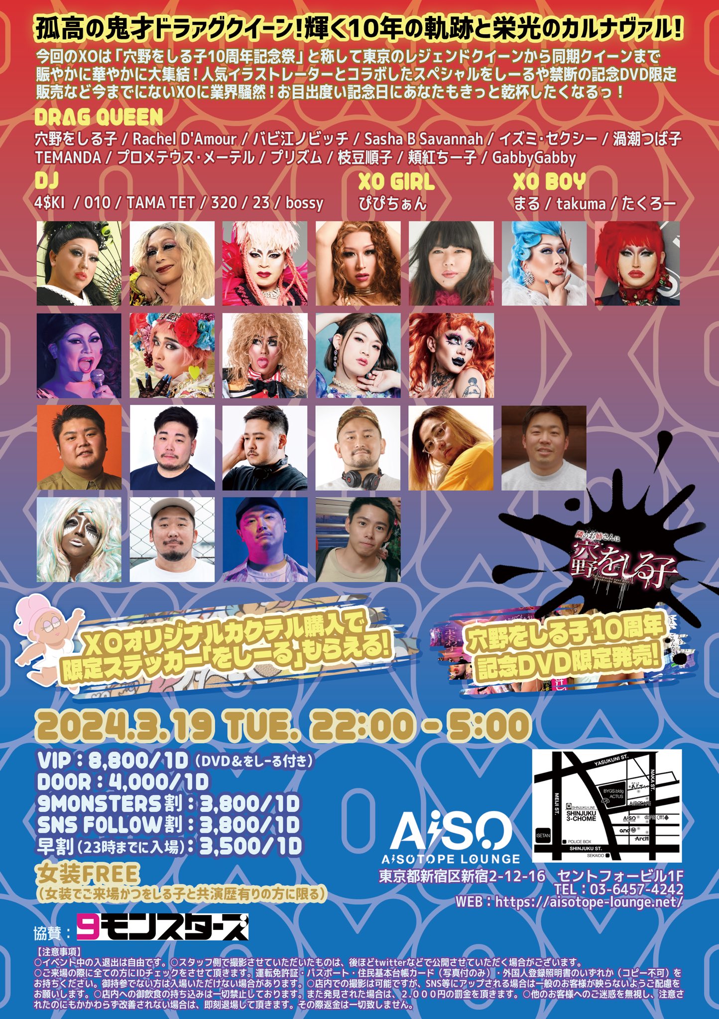 今回のXOは「穴野をしる子10周年記念祭」と称して東京のレジェンドクイーンから同期クイーンまで賑やかに華やかに大集結!