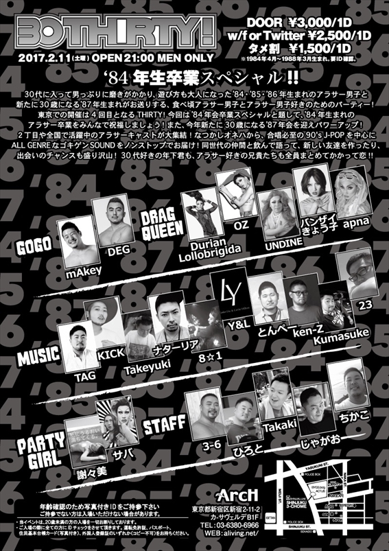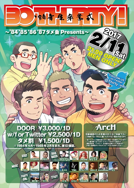 東京での開催は4回目となるTHIRTY! 今回は'84年会卒業スペシャルと題して、'84年生まれのアラサー卒業をみんなで祝福しましょう! また、今年新たに30歳になる'87年会を迎えパワーアップ!