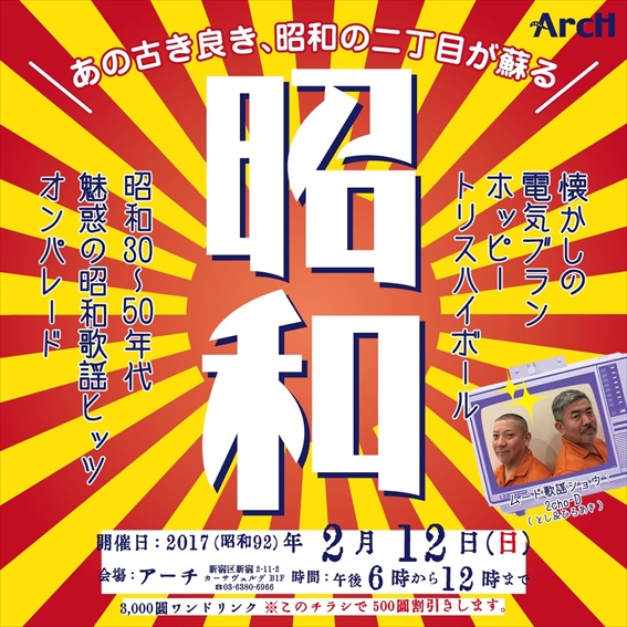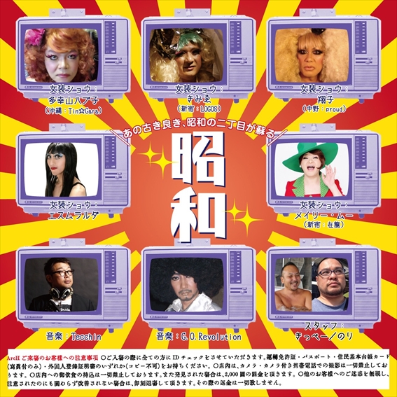 魅惑の昭和。1960〜1980年代の懐かしの二丁目を彷彿とさせる曲とパフォーマンス。一晩だけ昭和に浸りましょう!