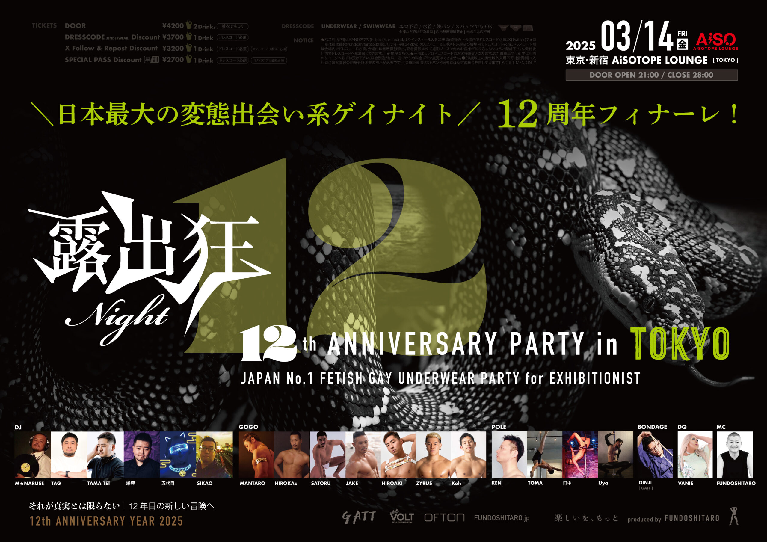 ★パス割[早割]はBANDアプリ(https://taro.band/よりインストール&参加申請)登録の上会場内でドレスコード必須。X(Twitter)フォロー割は褌太郎(@fundoshitaro)又は露出狂ナイト(@642kyo)のXフォロー&リポスト必須及び会場内でドレスコード必須。ドレスコード割は会場内でドレスコード必須。会場内は無断撮影禁止。記念撮影は公式撮影ブースで他のお客様が映り込まないようご配慮下さい。受付後店内でドレスコードへお着替えできます。手荷物検査あり。