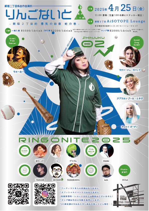 また女形衆の”新顔”として、新宿2丁目の次世代を担うクイーン、DJたちを育てる『UZMK Z』から、サヴァージュ・サバンナ、クアラルンプール・とき子、キョウト ガーデンも春のりんごないと盛り上げていきます!