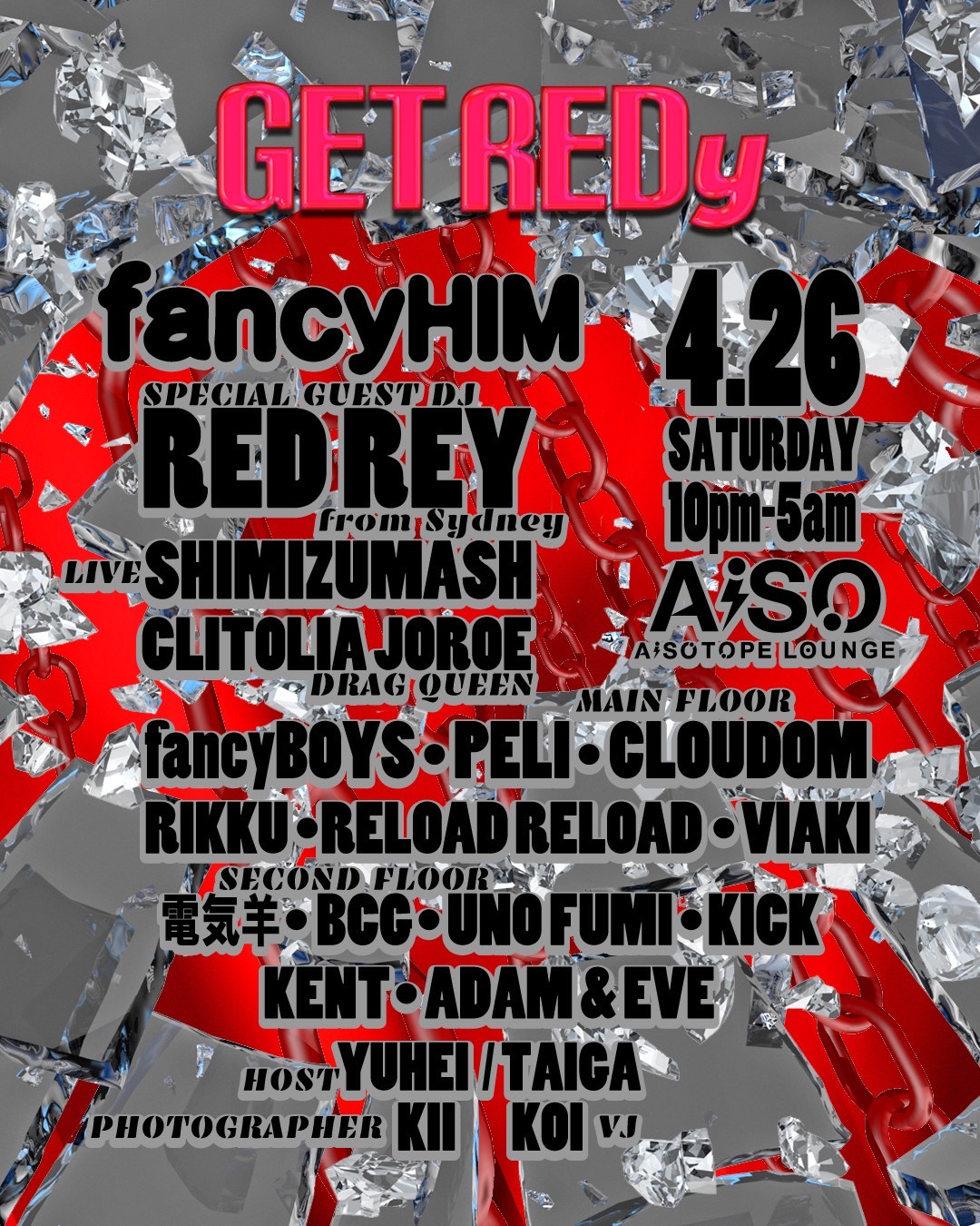 シドニーとパリを拠点に活躍するDJ、RED REYがこのパーティーの為に初来日する他、SHIMIZUMASHのスペシャルライブ、ホストに初出演のCLITOLIA JOROEが登場!