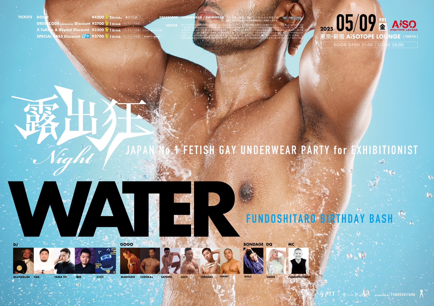 ★パス割[早割]はBANDアプリ(https://taro.band/よりインストール&参加申請)登録の上会場内でドレスコード必須。X(Twitter)フォロー割は褌太郎(@fundoshitaro)又は露出狂ナイト(@642kyo)のXフォロー&リポスト必須及び会場内でドレスコード必須。ドレスコード割は会場内でドレスコード必須。会場内は無断撮影禁止。記念撮影は公式撮影ブースで他のお客様が映り込まないようご配慮下さい。受付後店内でドレスコードへお着替えできます。手荷物検査あり。