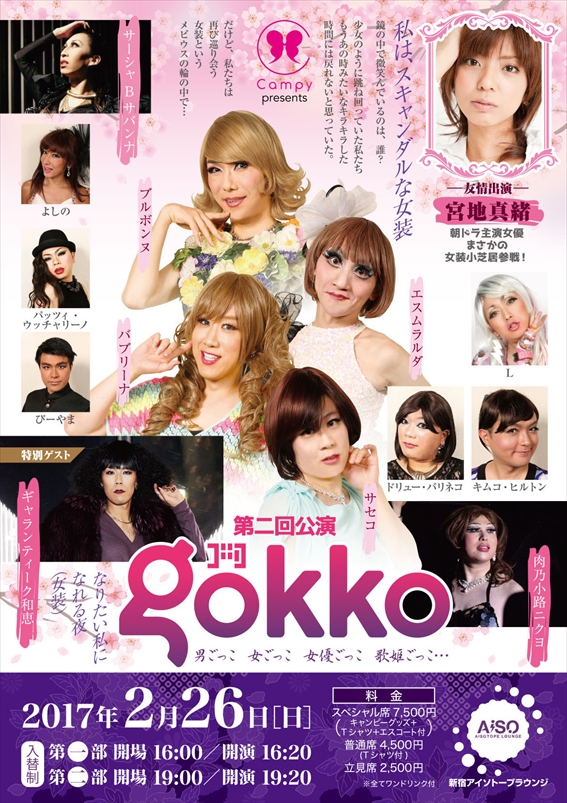 休日の夕方からお席で、女装たちのオリジナル小芝居と生歌が楽しめるオトナのイベント『GOKKO』。ブルボンヌ・エスムラルダ・バブリーナ・サセコらの女優ごっこ編には、朝ドラ主演女優・宮地真緒さんが友情出演! 肉乃小路ニクヨの歌姫編には、星屑スキャットでもおなじみギャランティーク和恵さんが登場。