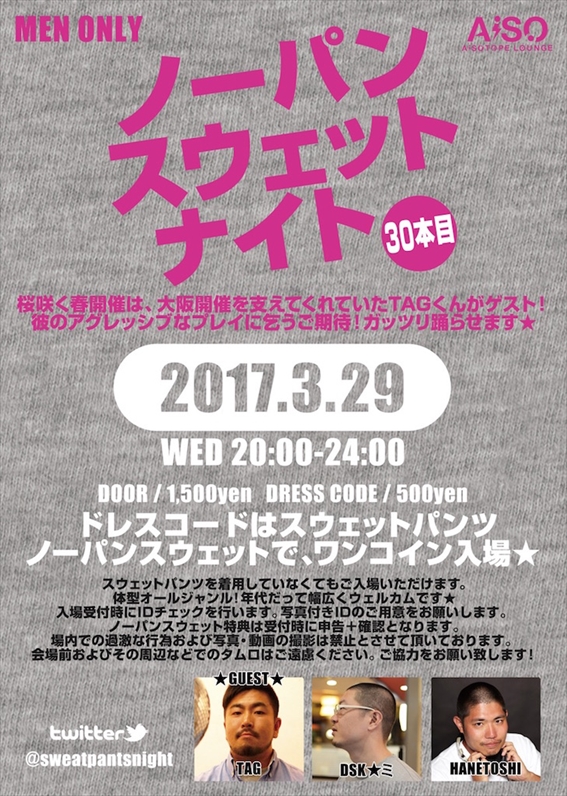 ・ノーパンスウェット割は受付時に申告+確認となります。事前にノーパンスウェットになってご来場下さい。スタッフが確認します!