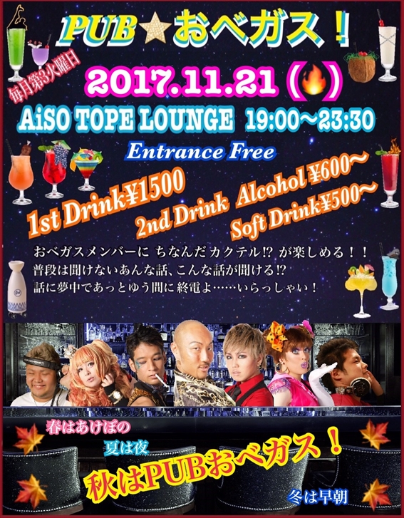 毎月第1月曜日開催中のAiSOの人気ショーイベント「おベガス!」のバー営業!
