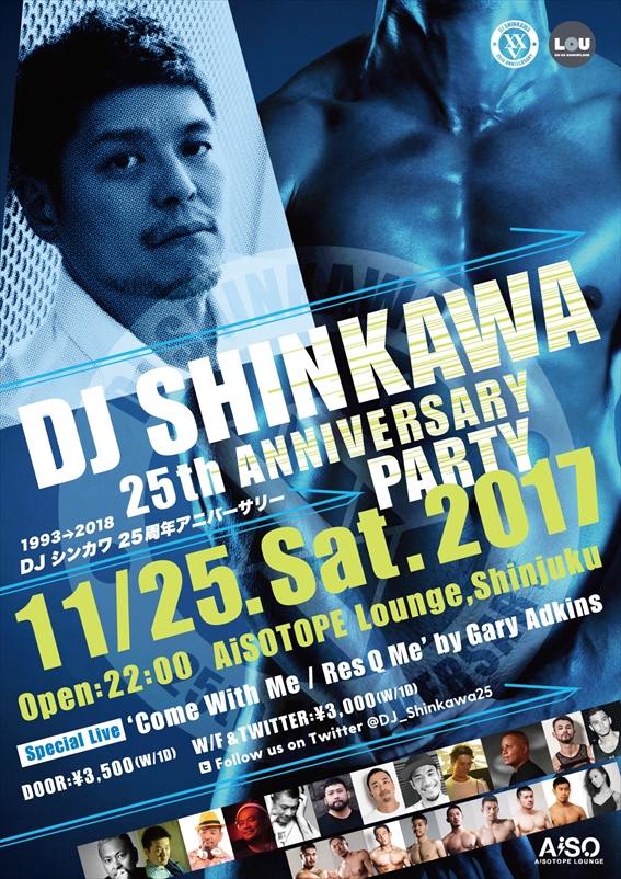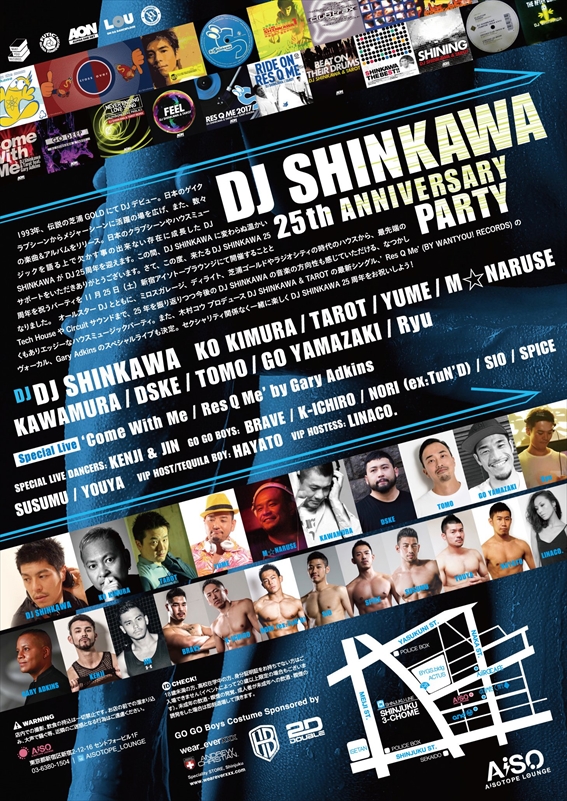 DJ SHINKAWA 25th ANNIVERSARY PARTY at AiSOTOPE Lounge in Shinjuku on Saturday, 25 November, celebrating the 25th Anniversary of one the of legendary best top house/techno DJ in Japan, DJ SHINKAWA, featuring also other top DJs in Tokyo such as KO KIMURA etc. entertained by Tokyo’s sexiest GOGO boys and a special live performance by Gary Adkins, the vocal of Res Q Me, remixed by DJ Shinkawa & TAROT, produced byKO KIMURA, the music all nightclubbers remembered at the time of late 90’s. Come celebrate & feel the vibe of today’s most cutting edgy house music as well as all those house classics in the 90’s.