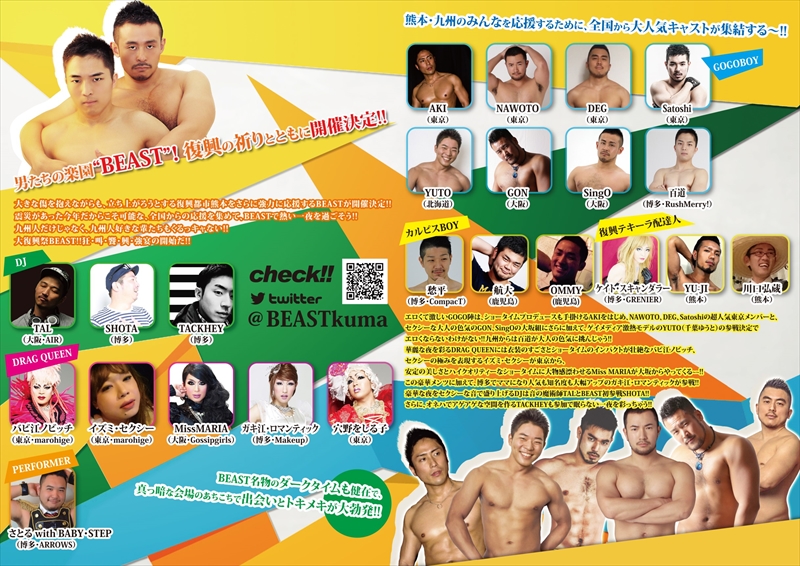 男たちの楽園“BEAST”復興都市熊本で開催。九州男児が集う!!ゲイオンリーの祭典。